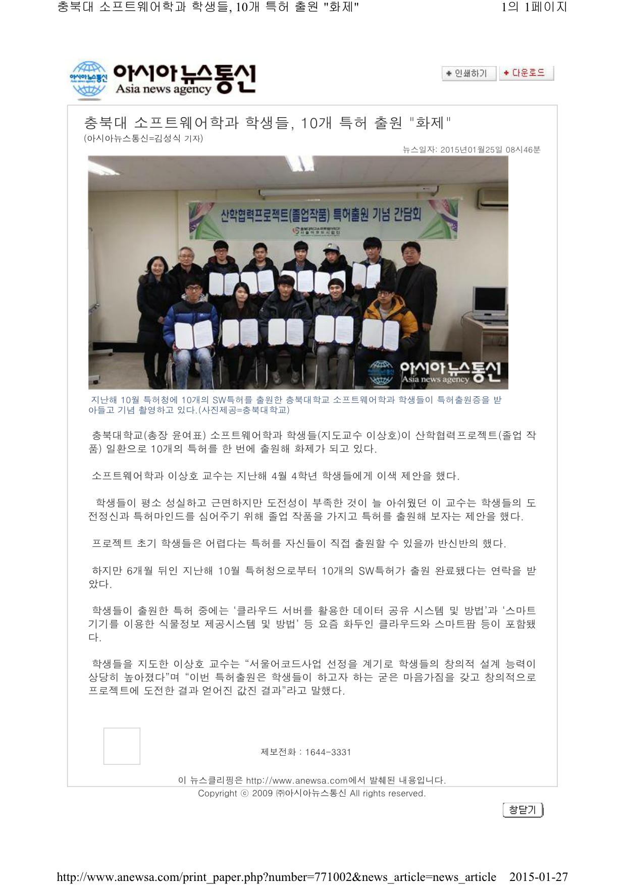 » 2014 충북대 소프트웨어학과 학생들, 10개 특허 출원 "화제"-아시아뉴스통신(2015.1.25) file 관리자 2017.03.15 954