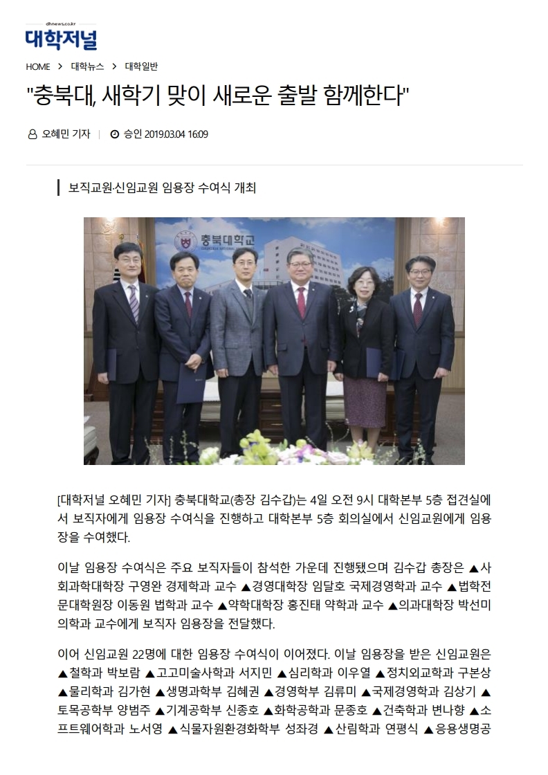 » 2019 충북대 새학기 맞이 새로운 출발 함께한다(신임교수-노서영교수님)-대학저널(2019.3.4) file 관리자 2020.01.17 787