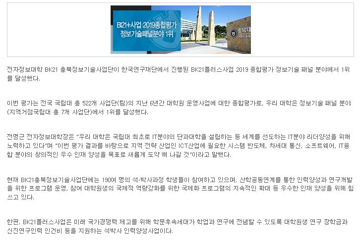» 2021 BK21충북정보기술사업단, BK21플러스사업 2019 종합평가 정보기술 패널 분야 1위 file 관리자 2021.03.31 783